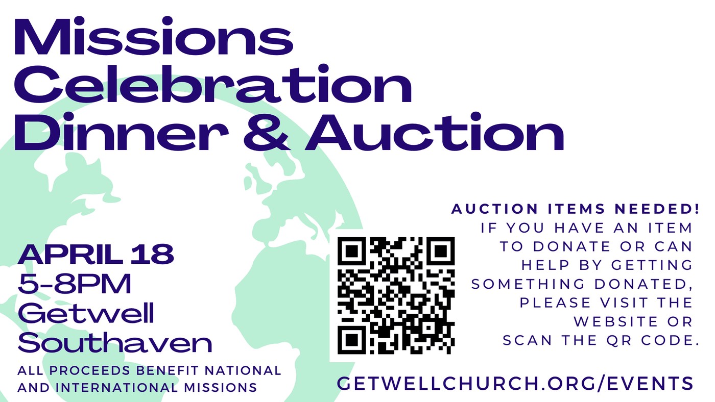 It's time for one of Getwell's largest missions events - the Missions Celebration Dinner & Auction! This is a fun event for all ages that features a great dinner, celebration of all that God has done through Getwell Missions this year, and a large silent and live auction!